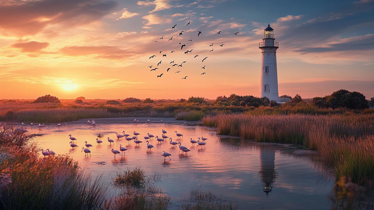 Los terrenos que rodean el faro de Faraman forman parte de un mosaico ecológico donde conviven especies vegetales adaptadas a la salinidad del suelo y aves migratorias que utilizan la región como punto de descanso en sus rutas transoceánicas. Las marismas cercanas sirven de hábitat a flamencos rosados, garzas y numerosas especies de limícolas que encuentran alimento en las aguas poco profundas. La vegetación halófila, compuesta por plantas capaces de prosperar en ambientes salinos, crea paisajes cromáticos cambiantes según las estaciones del año. Este entorno natural no solo enriquece el valor ecológico del área, sino que también contribuye a la experiencia de quienes visitan el faro, ofreciendo una perspectiva integral donde el patrimonio arquitectónico se contempla en armonía con la naturaleza salvaje mediterránea.