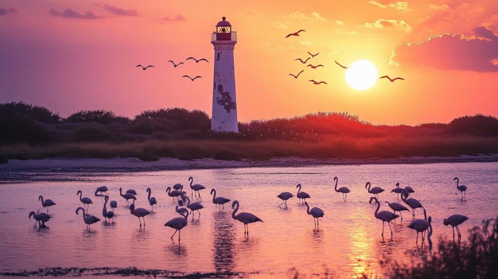 Los terrenos que rodean el faro de Faraman forman parte de un mosaico ecológico donde conviven especies vegetales adaptadas a la salinidad del suelo y aves migratorias que utilizan la región como punto de descanso en sus rutas transoceánicas. Las marismas cercanas sirven de hábitat a flamencos rosados, garzas y numerosas especies de limícolas que encuentran alimento en las aguas poco profundas. La vegetación halófila, compuesta por plantas capaces de prosperar en ambientes salinos, crea paisajes cromáticos cambiantes según las estaciones del año. Este entorno natural no solo enriquece el valor ecológico del área, sino que también contribuye a la experiencia de quienes visitan el faro, ofreciendo una perspectiva integral donde el patrimonio arquitectónico se contempla en armonía con la naturaleza salvaje mediterránea.